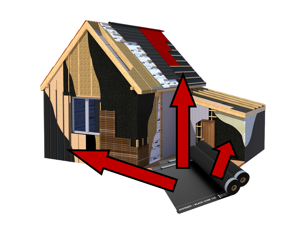 Pilnībā melna 3 slāņu difūzijas membrāna slēgtām fasādēm un arī standarta jumtiem ar divām pašlīmējošām malām.